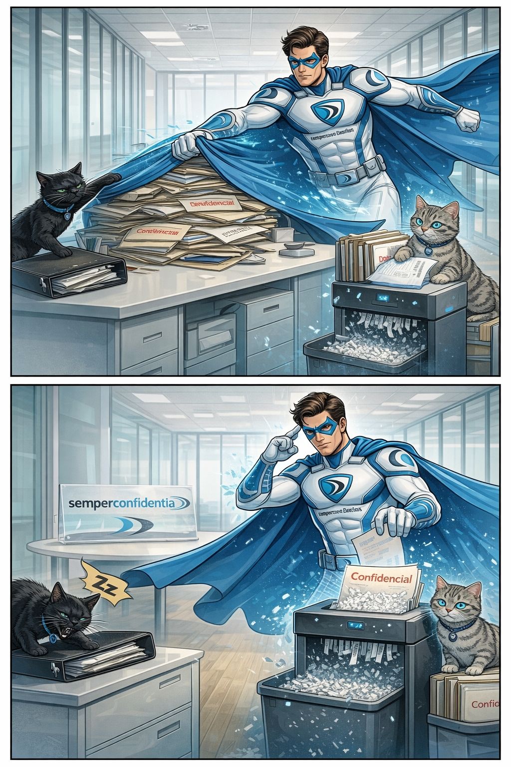 Semperman proteje la documentación impresa y procede a destruir la que ya no es necesaria.